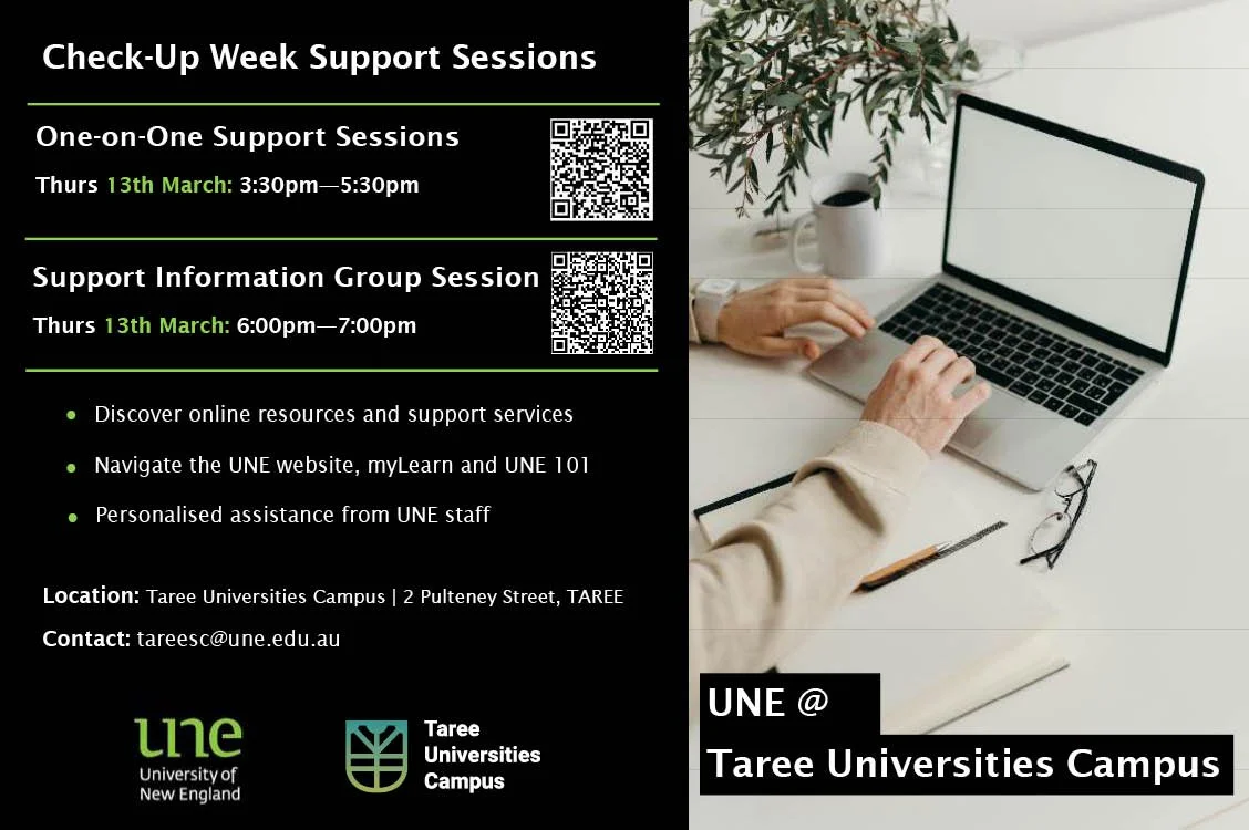 Face to face study support sessions are available at TUC with a UNE staff member next week. Whether you’re a first-year student needing help getting started or a current student with questions about enrolment, degree planning, scholarships, or anything else, this is a great opportunity to get personalised support.